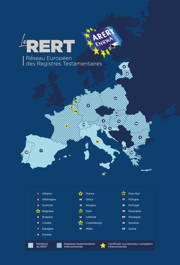 Dans le respect de la Convention de Bâle relative à l’établissement d’un système d’inscription des testaments du 16 mai 1972, les Etats disposant d’un registre de dispositions de dernières volontés adhérents de l’ARERT peuvent interconnecter ces registres, permettant ainsi à tout citoyen européen de découvrir les dispositions testamentaires laissées par un défunt quelque soit le pays où cette disposition a été inscrite.